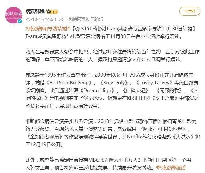 韩国娱乐圈又添一桩喜事!10月16日,韩媒曝出T-ara出身的演员咸恩静将与导演金炳宇于11月30日在首尔某酒店完婚。消息一出,瞬间点燃粉丝圈——有人狂刷“女神终于嫁了”,也有人调侃“T-ara的选婿标准果然又是才华压倒颜值”。